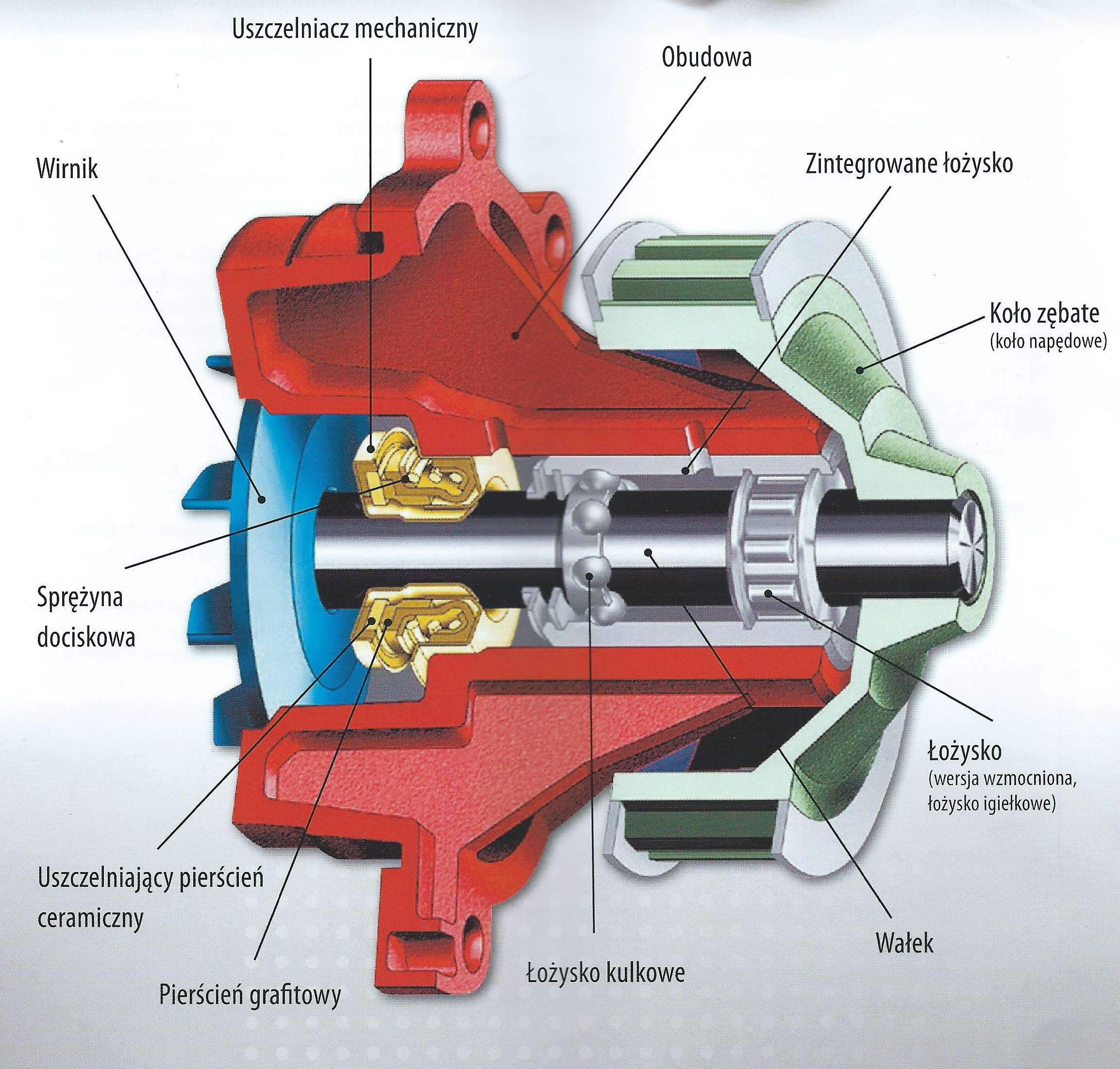 POMPY UKŁADU CHŁODZENIA Pompa układu chłodzenia jest sercem układu chłodzenia które zapewnia bezproblemową eksploatację pojazdu. Pierwszą ważną sprawą związaną z pompą układu chłodzenia, o której mało kto wie jest tzw. wyciek technologiczny, który jest naturalny i nie stanowi podstawy do reklamowania pompy. Wyciek ten jest niewielki lub wręcz minimalny, a spowodowany jest tym, że na wałku umieszczony jest mechaniczny uszczelniacz. Uszczelniacz ten zbudowany jest z pierścieni ślizgowych, które wymagają smarowania i chłodzenia – jest to realizowane za pomocą płynu chłodniczego, jednak jego niewielka część może wydostawać się otworem technologicznym. Niektóre modele pomp są wyposażone w niewielką nadlewkę, która tworzy zbiorniczek, do którego ścieka płyn i jest on niewidoczny dla użytkownika. Żywotność pompy układu chłodzenia zależy od następujących czynników:
